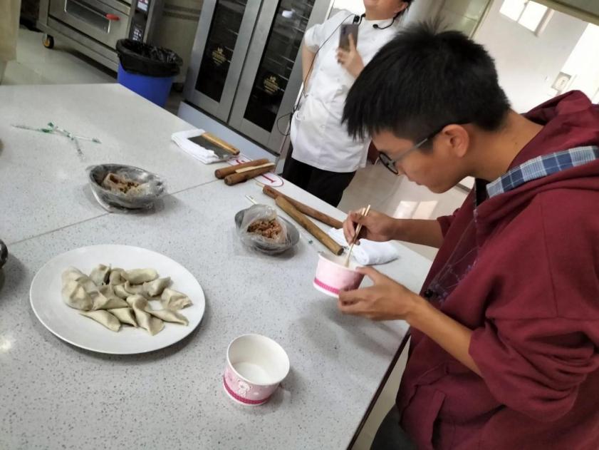 在包饺子环节,八位同学自高奋勇的举手,利用老师上课讲述的技巧包出各样的饺子。其中一位同学徐婉儿笑道:“看到老师的示范,自己就特别向亲自试试,虽然外观存在瑕疵,但是又得到老师的表扬,而且老师还亲自示范怎么捏饺子。”