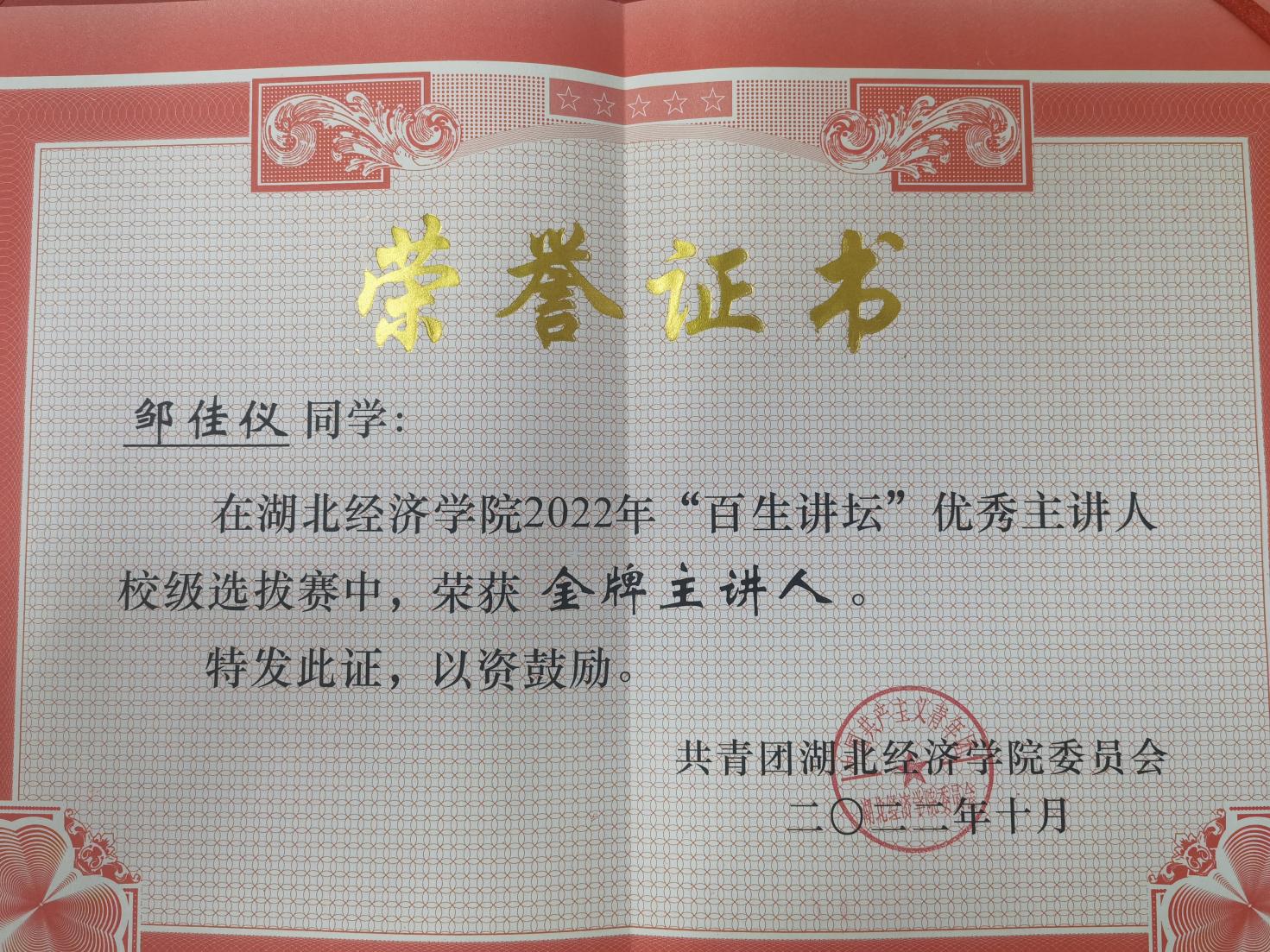 本网讯(通讯员 刘炎凯)10月9日,为持续推进习近平新时代中国特色社会主义思想进支部、进社团、进网络、进团课,由校团委、校学生会主办的2022年“百生讲坛”优秀主讲人校级选拔赛在五号教学楼二号报告厅举行。我院国贸2042班邹佳仪同学在此次校级选拔赛中脱颖而出,以排名第一的成绩荣获“金牌主讲人”的称号,并获得了“百生讲坛”省赛的资格。
