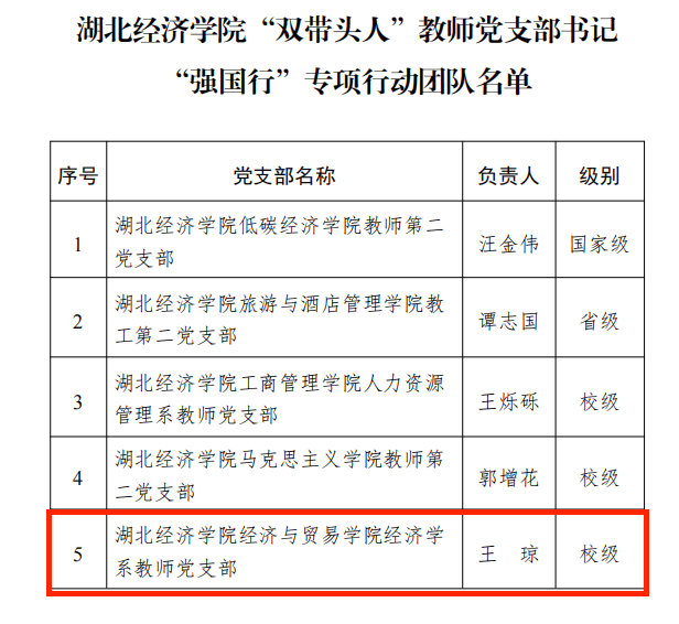 近日,教育部办公厅公布了全国高校“双带头人”教师党支部书记“强国行”专项行动团队(以下简称“强国行”)名单,学校 1 名“双带头人” 入选全国高校“双带头人”教师党支部书记“强国行”专项行动团队,1 名“双带头人”入选全省高校“双带头人”教师党支部书记“强国行”专项行动团队。我院经济学系教师党支部入选学校高校“双带头人”教师党支部书记“强国行”专项行动团队(全校共计3个)。