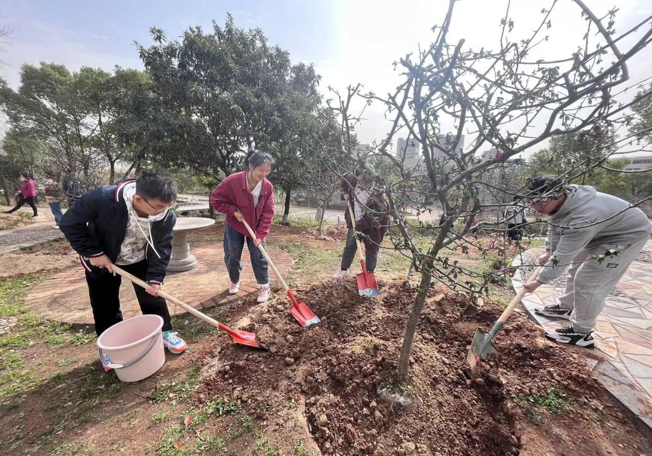 在活动中,我院师生代表满怀激情、团结一心,手持铁锹、手提水桶,共同前往指定区域分工合作。在老师们与同学们的相互配合下,有的人挥锹铲土,有的人扶树填土,还有的人培土浇水,共同完成了这次活动。通过辛勤的劳作,一棵棵树苗在经院“落户安家”。十年树木百年树人,植树就像育人,既需要打好前期的基础,也需要长期呵护、精心浇灌。我院师生代表积极参与植树活动,响应了国家绿色和谐生态理念,践行了学校“三有三实”人才培养战略,为学校和学院的发展增添了亮色。