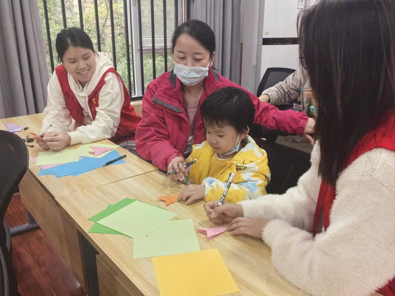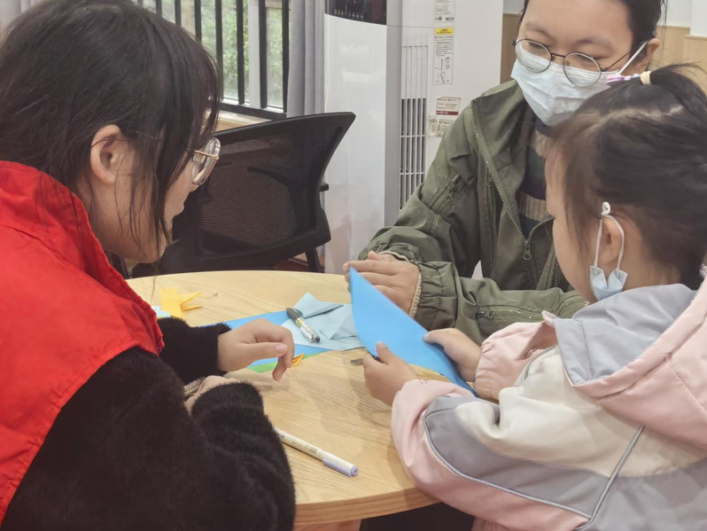 在初步学习剪纸技巧后,小朋友和父母在志愿者的协助下,开始动手创作。他们静坐在桌前,轻轻展开彩纸,用铅笔在纸上勾勒出心仪的图案轮廓。随后,右手握住剪刀,左手轻按彩纸,沿着线条仔细裁剪。