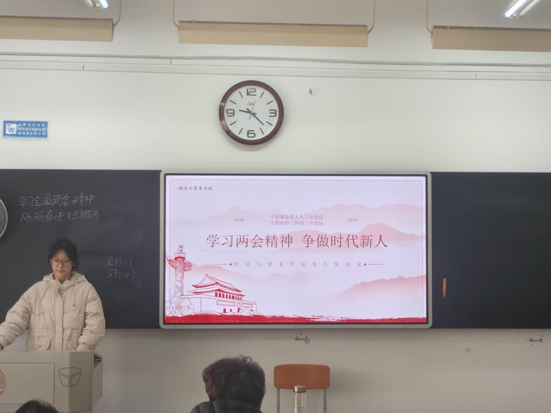 商务经济学系学生党支部书记左寅生结合学科特点与学生成长需求,为学生党员系统解读两会政策方向,强调青年党员应立足专业优势,服务国家经济发展大局。3月9日,学生党员利用晚讲评,走进班级宣讲两会精神,以案例分析、互动问答等形式,推动理论学习向基层延伸。