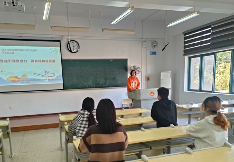 本网讯(通讯员:杨炆桀)为深入学习贯彻党的创新理论,凝聚青年党员奋进力量,3月24日,国际经济与贸易系学生党支部在教二216教室开展3月主题党日活动。本次活动以 “党建引领聚合力,两会精神促发展”为主题,由党支部副书记杨诗奕主持,全体学生党员共同参与。
