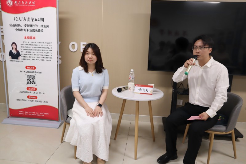 杨飞月校友以“实战解码:投资银行的一线业务全解析与职业成长路径”为主题分享行业洞见。在访谈过程中,杨飞月结合自身在校学习经历和工作经历,以生动案例解析投资银行的一线业务逻辑。她详细介绍了自己在校的学习备考经验,以及工作中的项目经历。谈及个人的学习成长,她建议学弟学妹们坚定持续学习的动力、锤炼抗压能力,积极投身到企业实习中主动积累实操经验。