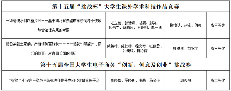 经过省级复赛的激烈角逐,我院作品《一渠清流水何以富乡民——基于湖北省赤壁市羊楼洞港小流域综合治理实践的考察》、《栀香染就土家韵,产链铺陈富路长——“一栀花”赋能乡村振兴的故事:对宜昌长阳的调研》均荣获“挑战杯”省级三等奖;作品《“智绿”小程序——塑料与纸壳废弃物分类回收智慧管理平台》荣获“三创赛”省级二等奖。
