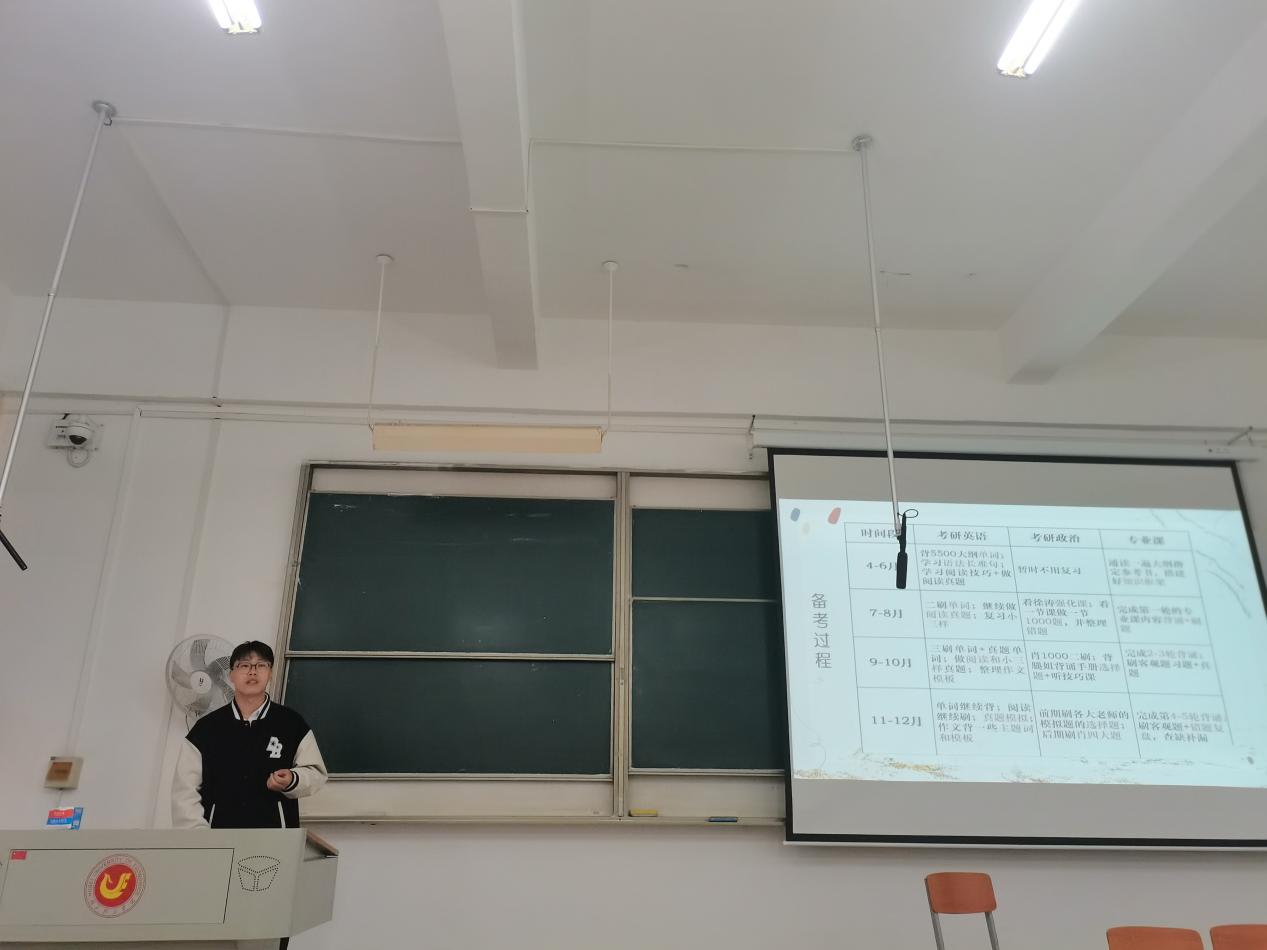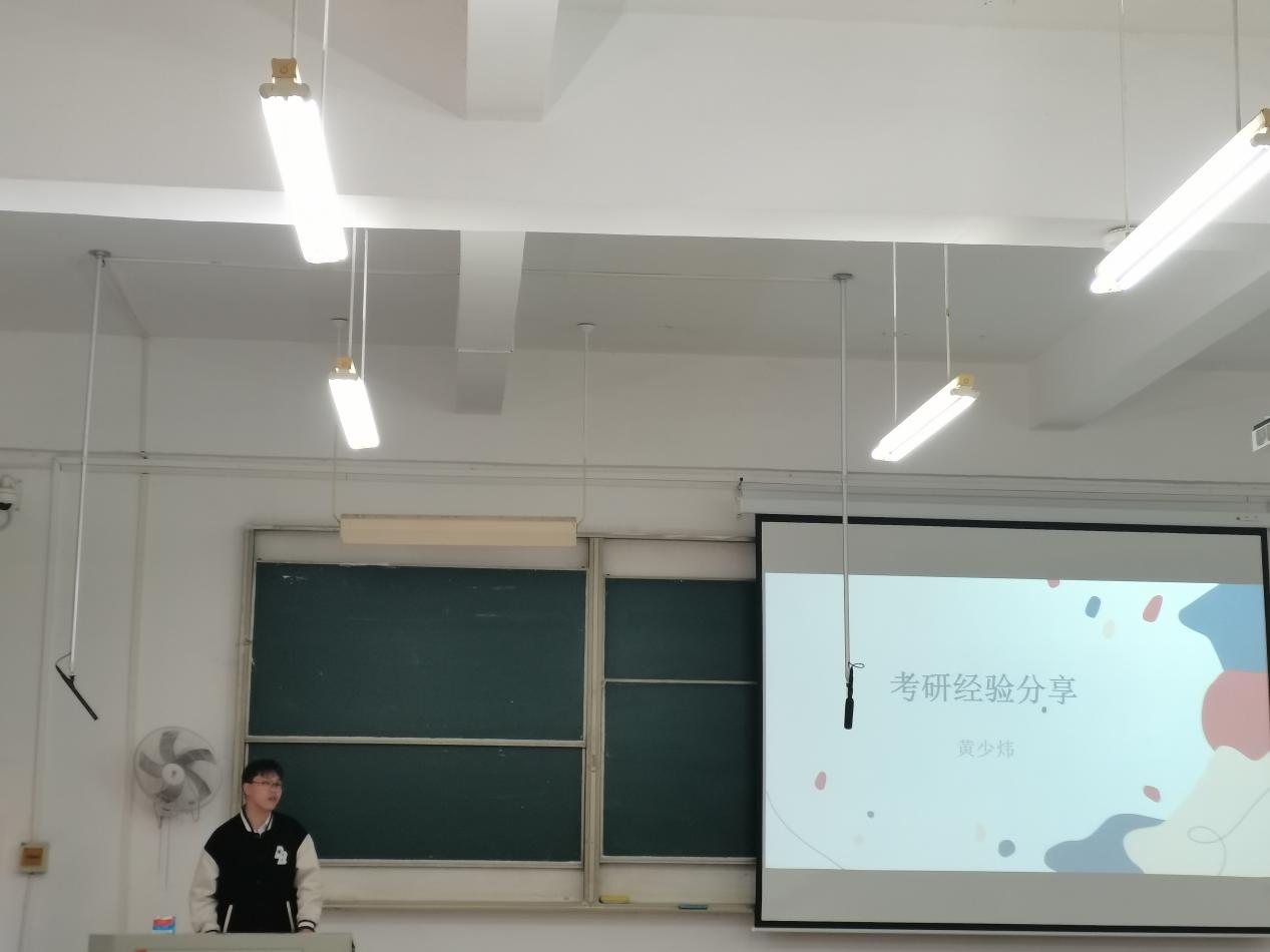 会上,黄少炜从院校及专业选择、考研流程、备考过程和经验总结四个方面进行分享。黄少炜从亲身经历出发,强调了考研选择的重要性以及怎样合理评估院校及专业,详细介绍了各科目的备考时间以及备考规划,指出考研是一场孤独的旅程,适度的调整会让坚持更久。他希望学弟学妹们坚定目标,养成固定的作息时间,踏踏实实走完考研这一年,克服考研路上的困难,一战成硕。