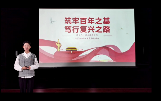 邹佳仪同学以《筑牢百年之基,笃行复兴之路》为题,以迎接党的二十大胜利召开为背景,围绕近代中国历史进程、改革开放重大意义和深远影响,生动讲述了中国共产党百年发展历程、中华民族伟大复兴之路、全面建设社会主义现代化国家新征程,呼吁新时代的中国青年肩负历史使命,坚定前进信心,努力成为堪当民族复兴重任的时代新人。