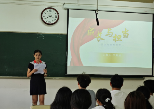 在先进榜样宣讲环节,学院特邀经济2241班乔云芳、经济2342班秦晓蕾、经济领航2441班李淼涵三位高年级先进学生代表,向新生们传授经验、分享心得。国家奖学金获得者乔云芳同学从学习方法、时间管理、自律养成等方面,分享了如何高效利用大学时光,夯实专业基础,追求卓越学业成绩的心路历程,其严谨的态度和优异的成绩为新生树立了勤学标杆。“三创赛”省奖获得者秦晓蕾同学生动讲述了自己参与学科竞赛的苦与乐,她鼓励新生新生勇于尝试、不怕失败,在竞赛中锤炼创新思维和实践能力。在社会实践方面表现突出的李淼涵同学则讲述了自己参加“支部共建”暑期社会实践的故事,并倡议新生们积极投身社会实践,在实践中受教育、长才干、作贡献。