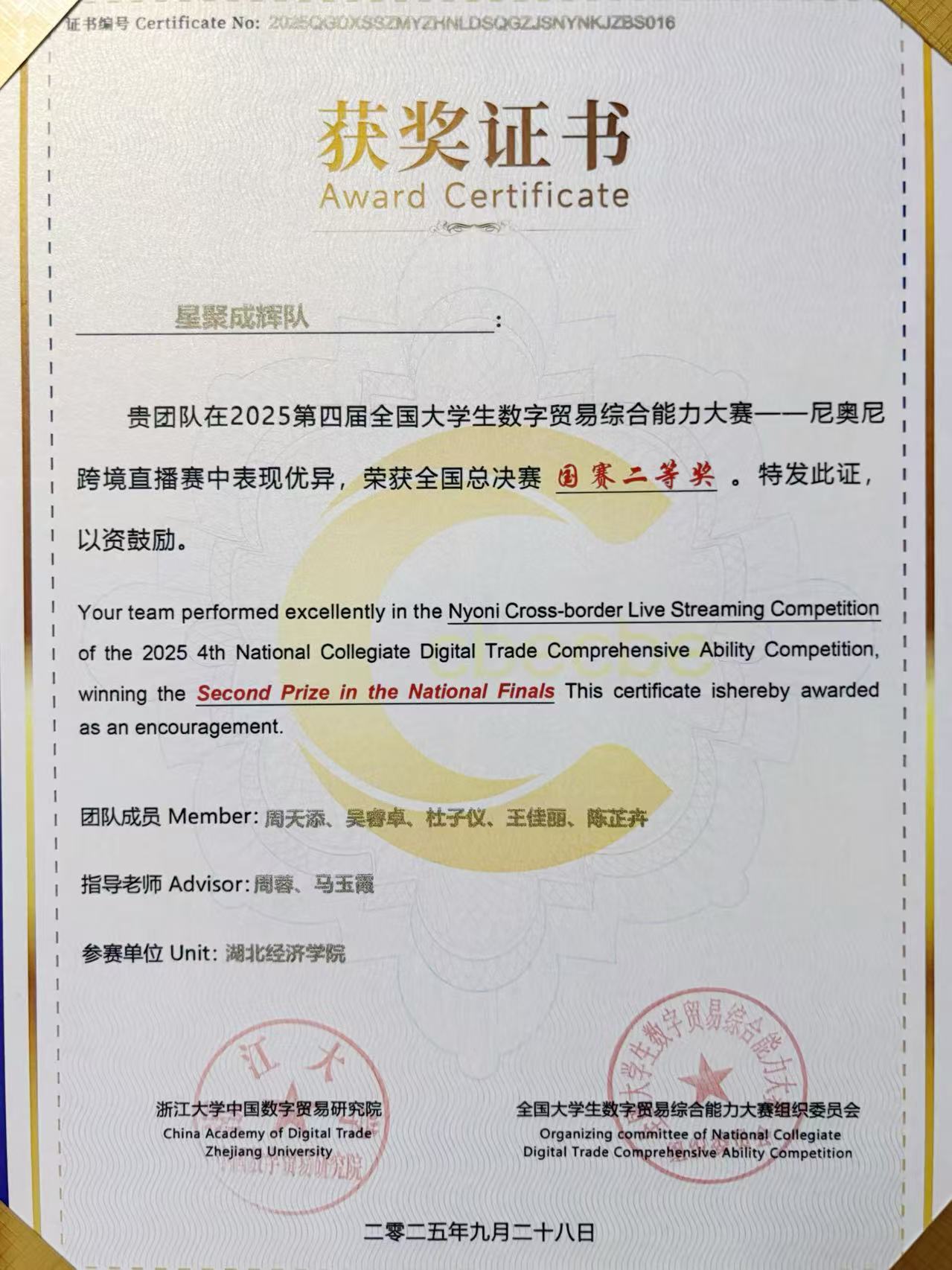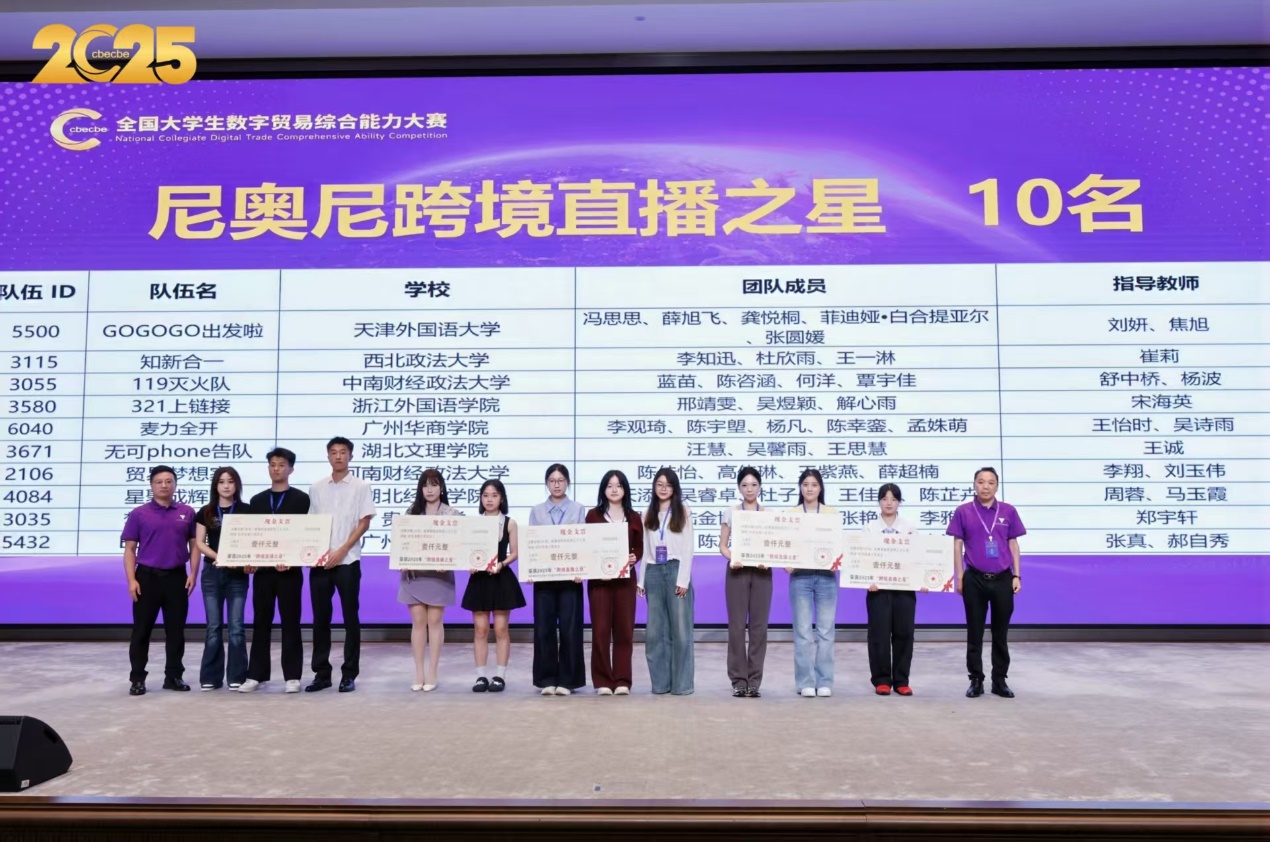 2025年9月28日,第四届尼奥尼全国大学生数字贸易综合技能大赛跨境直播赛道全国总决赛颁奖典礼在浙江大学紫金港校区举行,我院“星聚成辉队”在全国总决赛中强势突围,荣获全国二等奖。