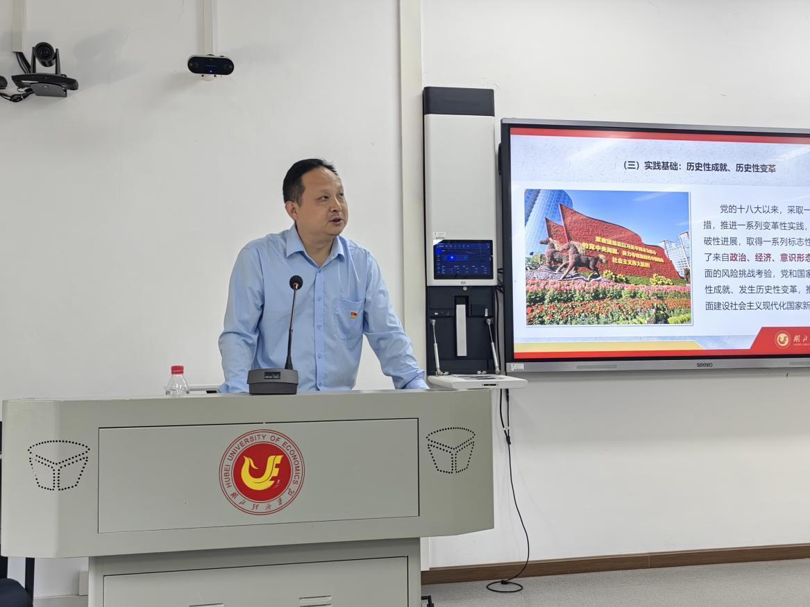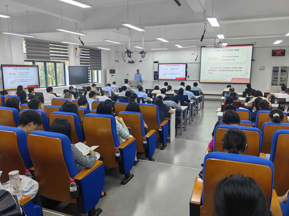 根据学校学习贯彻习近平新时代中国特色社会主义思想主题教育工作安排,6月1日下午,校党委常委、副校长付宏以《马克思主义中国化时代化新的飞跃》为题,为党员讲授专题党课。教务处、财务处、审计处(采招办)、国际交流与合作处、招生办公室、体育场管理中心、太阳成集团tyc539、低碳经济学院、国际教育学院、实验教学中心等单位领导班子、全体教工党员、学生党员代表参加学习。