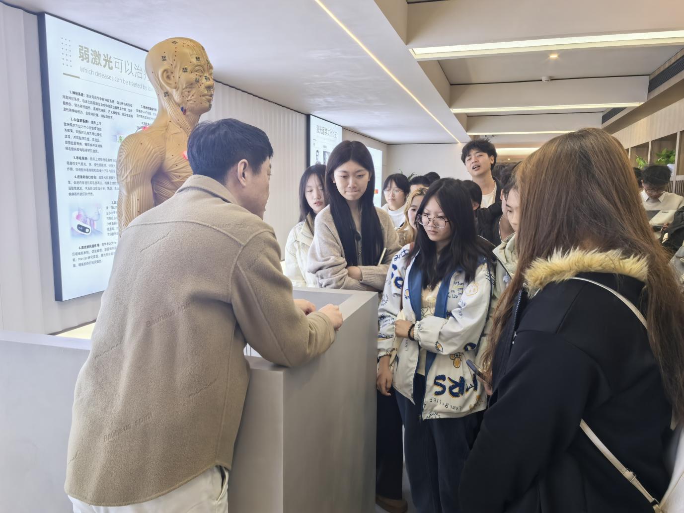 在参观企业过程中,光盾科技企业代表向学生们详细介绍了激光技术在医疗中的应用原理以及激光设备对人体健康管理的功效,并向同学们展示了企业生产、研发的各类弱激光医疗设备。这类产品在心血管、免疫系统等方面发挥着辅助治疗作用,越来越多地被应用于家庭和医疗机构中,广受消费者好评。