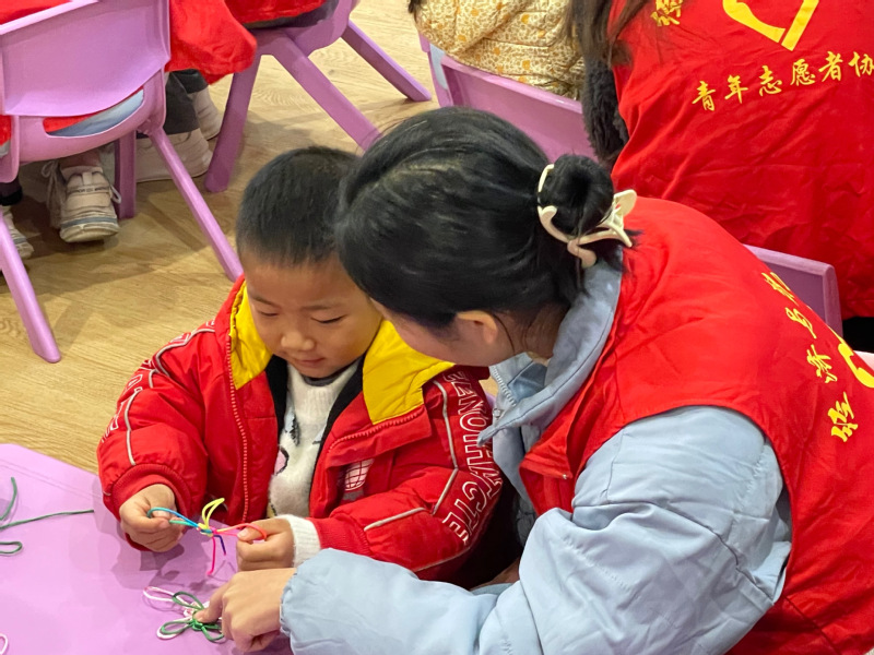 志愿者耐心教小朋友编制中国结