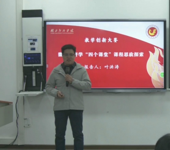 叶洪涛老师获课程思政组二等奖,参赛课程为《微观经济学》。叶老师以微观经济学“四个课堂”教学模式为主题,针对日常教学中的不足与痛点,阐述了教学改革的必要性和以学生为中心、知行合一的育人理念,以“中国故事”为依托,通过讲“故事”进行经济分析,同时从“故事”中提炼习近平经济思想融入教学,达成知识传授、能力培养与价值引领的统一。叶老师介绍了“四个课堂”教学模式,即“实践课堂”之“行”——社会实践与经济体验、“线下课堂”之“讲”——讲理论讲“故事”、“线上课堂”之“思”——独立思考与师生互动、“第二课堂”之“用”——学以致用,“四个课堂”立体化协同。叶老师教学改革的成效显著,微观经济学省级课程思政示范项目获批,学生第二课堂成果丰硕。