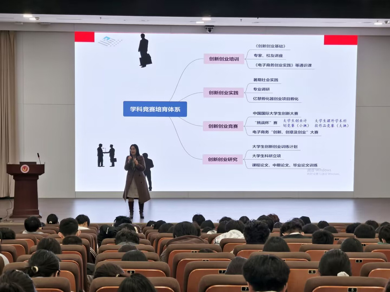 随后,马玉霞副院长在主题分享中阐述了学科竞赛的核心意义,强调竞赛是连接理论与实践的重要纽带,能够有效提升学生的创新思维、团队协作和问题解决能力,是培养复合型人才的关键路径。接着,她系统梳理了学科竞赛的体系架构与项目来源:从国家级、省级到校级的三级竞赛体系中,重点解析了“国创赛”“挑战杯”等标杆赛事的赛道特征与评审导向;同时指出优质项目需立足专业特色、回应社会需求,可从科研课题延伸、生活痛点转化、产业技术革新等多维度挖掘创新源点。最后,围绕竞赛准备与突围策略,她提出“三阶备战法”:基础阶段需组建跨学科团队、打磨核心创意;提升阶段要强化作品可视化呈现与逻辑闭环;突围阶段则需精准匹配评审标准,通过差异化亮点设计实现脱颖而出。最后,马院长以温暖有力的话语激励经贸学子:“未来要多长本事、多看世界,把时间花在正事上,让丰富的知识储备、扎实的能力素养成为自己最坚实的底气。”