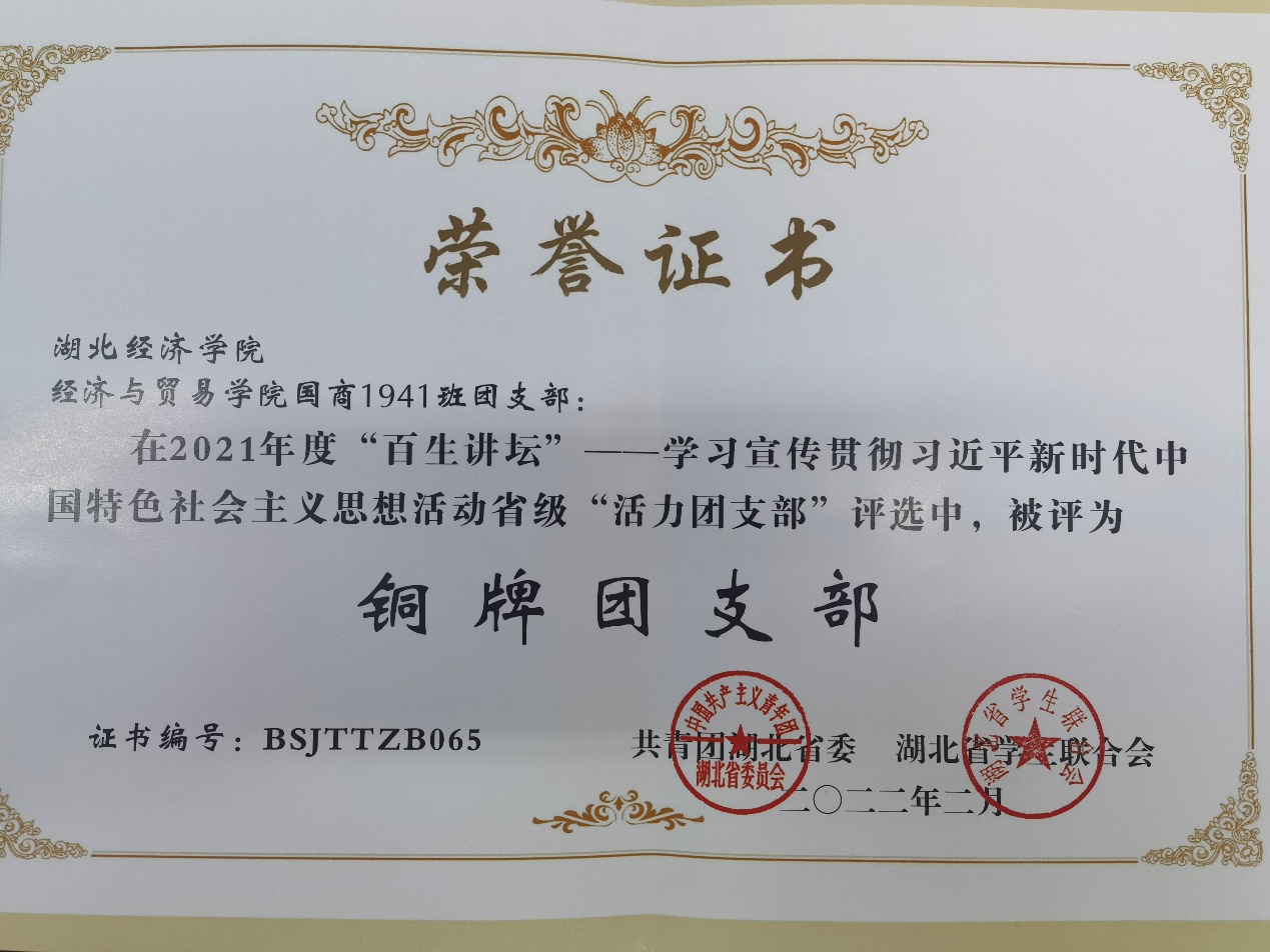 (通讯员 陈骏)2022年2月,我院国商1941团支部在湖北省2021年度“百生讲坛”——学习宣传贯彻习近平新时代中国特色社会主义思想活动省级“活力团支部”评选中,被评为省级铜牌团支部。