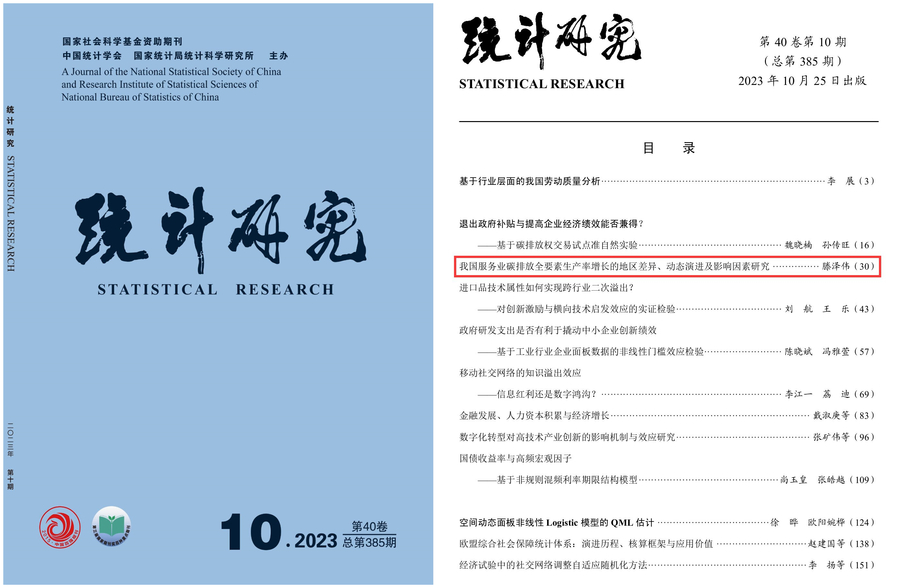 我院滕泽伟老师的研究成果“我国服务业碳排放全要素生产率增长的地区差异、动态演进及影响因素研究”在国内权威期刊《统计研究》2023年第10期正式发表。