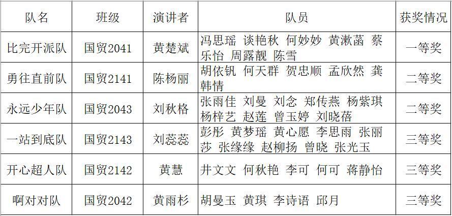 决赛以“The Story of HBUE and Me”(经院故事)和“ The Story of CPC”(党史故事)为主题。比赛现场,选手们精神饱满、自信大方,用流利的口语从不同角度和层面畅谈对主题的主题;在提问环节中,选手们反应迅速、思维敏捷,展现了扎实的英语语言功底。经过激烈角逐,最终国贸2041黄楚斌同学所在团队凭借出色的发挥脱颖而出,斩获一等奖;国贸2141陈杨丽、国贸2043刘秋格所在团队荣获得二等奖,国贸2142黄慧、国贸2042黄雨杉、国贸2143刘蕊蕊所在团队获得三等奖。