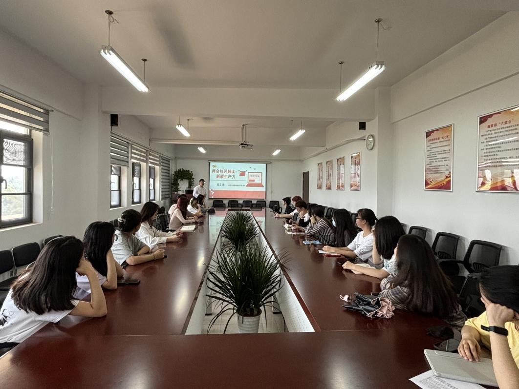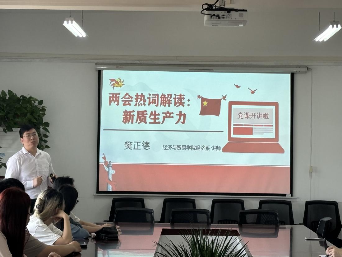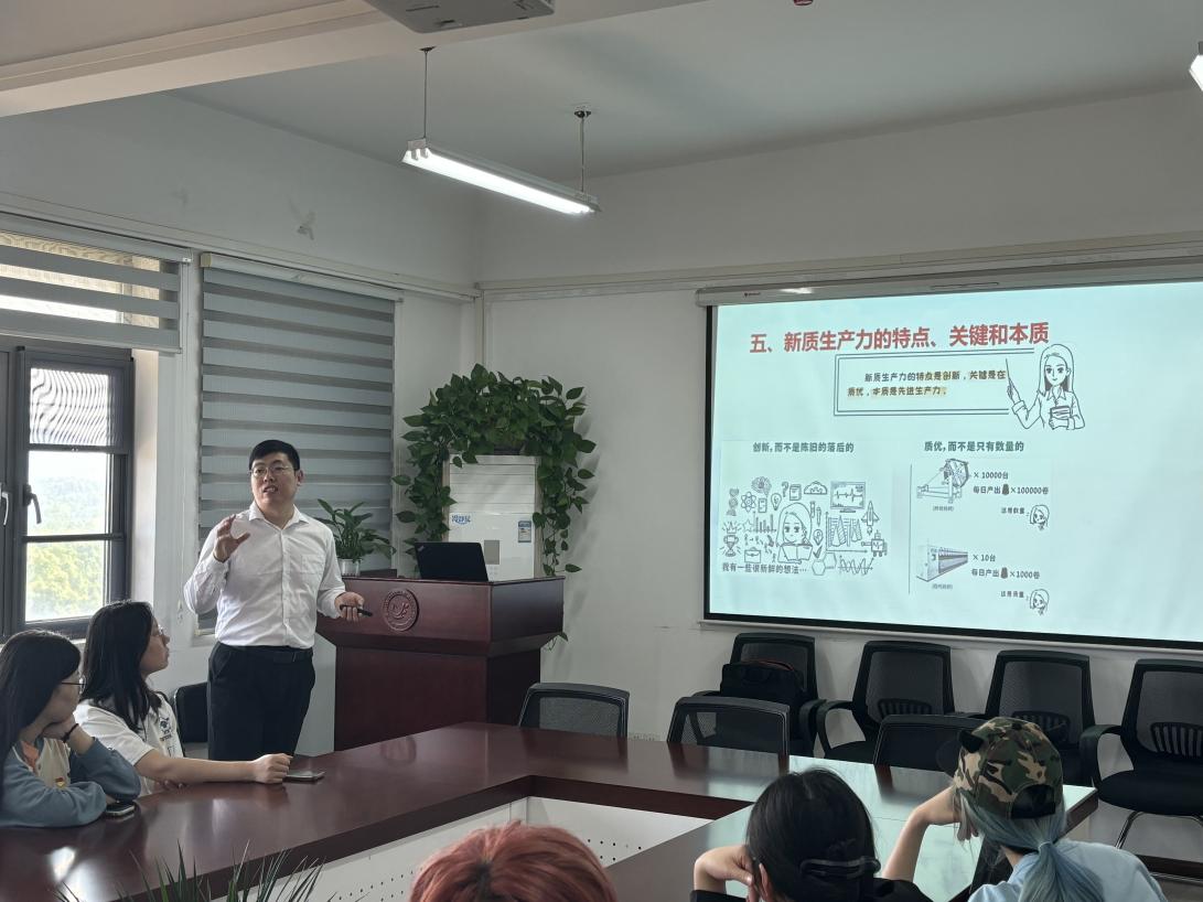 樊老师以“新质生产力”为主题,围绕新质生产力的概念、内涵、特征、理念等方面,为同学们全面、详细地解读和阐释了新质生产力的主要内容。同时,根据国内国际经济发展趋势,樊老师还引用具体事实和数据例证,准确传达了新质生产力关于打造新型劳动者队伍、用好新型生产工具、塑造新质生产关系的内在要求,强调了新质生产力对于当前中国培育壮大新兴产业,构筑未来发展新优势的重要性。最后,樊老师寄语同学们,要认真学习贯彻两会精神,准备把握新质生产力的内涵,着力发挥党员先锋模范作用,努力将自己打造成能够创造新质生产力的战略人才和掌握新质生产资料的应用型人才。